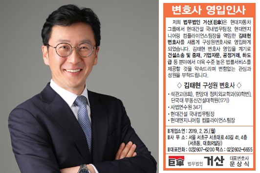 저희 법무법인 거산은 2018년 12월 31자로 현대자동차그룹에서 퇴사하시고 변호사로서 새출발하시는 김태현 변호사님을 구성원변호사로 영입하였습니다.